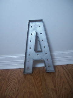 I found globe lights at Hobby Lobby. Once you have your letter you need to figure out how many bulbs you'll need. My A needed fifteen. I couldn't find a strand that was the right length so I got one that was a little longer and covered the extras to use them for extra cord.